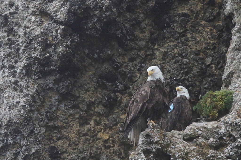 However, from 2002–2006, CINP, IWS, and The Nature Conservancy partnered together for an aggressive reintroduction program, returning bald eagles to their historic island haunts. Each year, for five years biologists released 12 bald eaglets at eight weeks old. Those raptors were not ready to fly just yet, so biologists placed them in hack towers, an open-air enclosure raised about 15 feet off the ground. Each tower was open but barred so the birds could feel the ocean air in their wings. Two to three eaglets shared a hack tower, and each enclosure was equipped with a nest, perch, and a trapdoor so biologists could throw fish to the eaglets without being seen, thus, not leaving their human imprint on the young eaglets. Four weeks later the hack tower was opened, and the eaglets were ready to fly. Today, there are roughly 50 bald eagles fanned out across the northern chain. There are 12 nesting pairs, and the rest are individual birds figuring things out on the rugged archipelago.